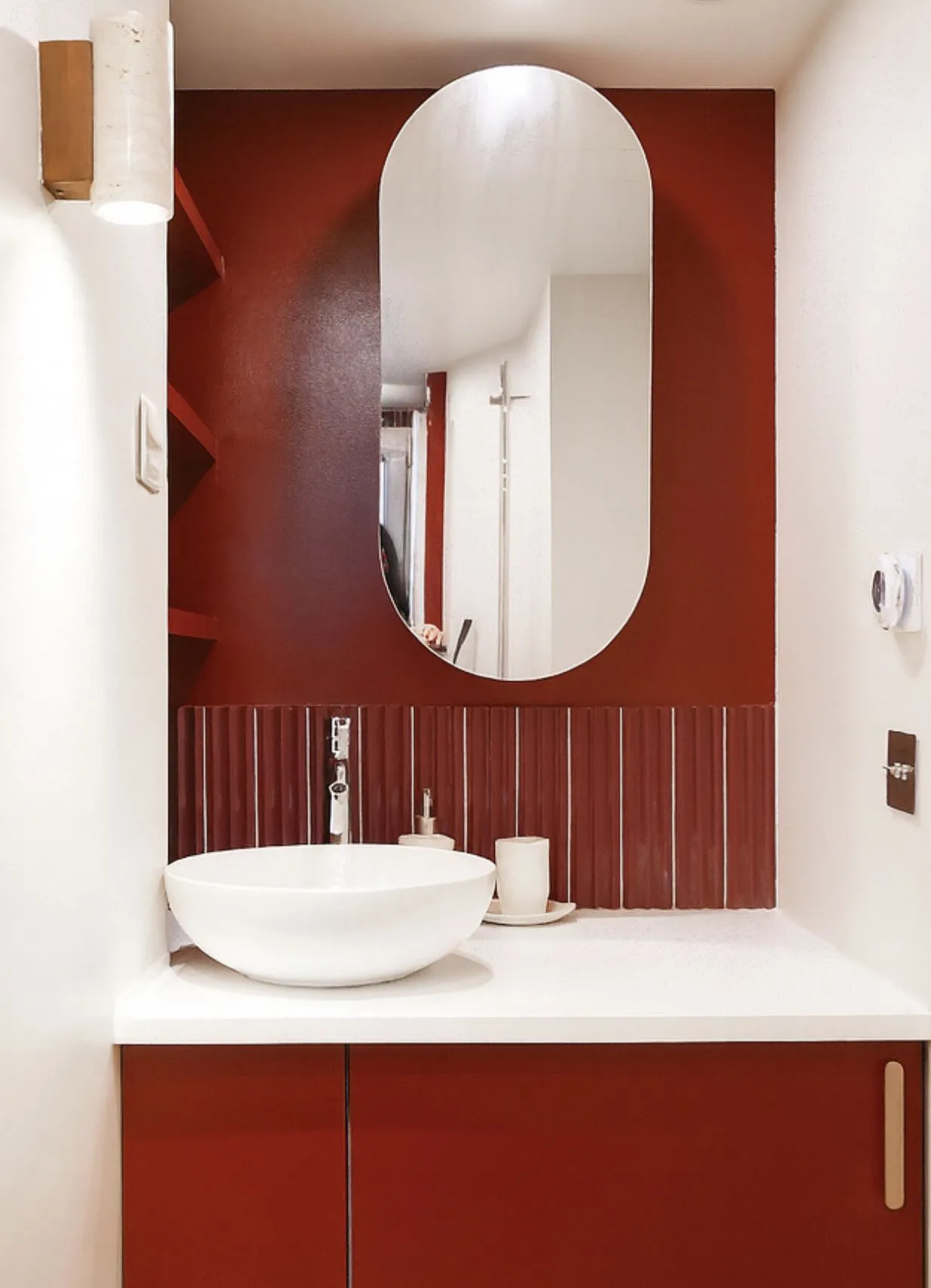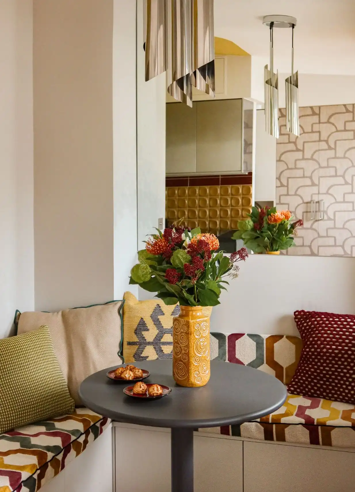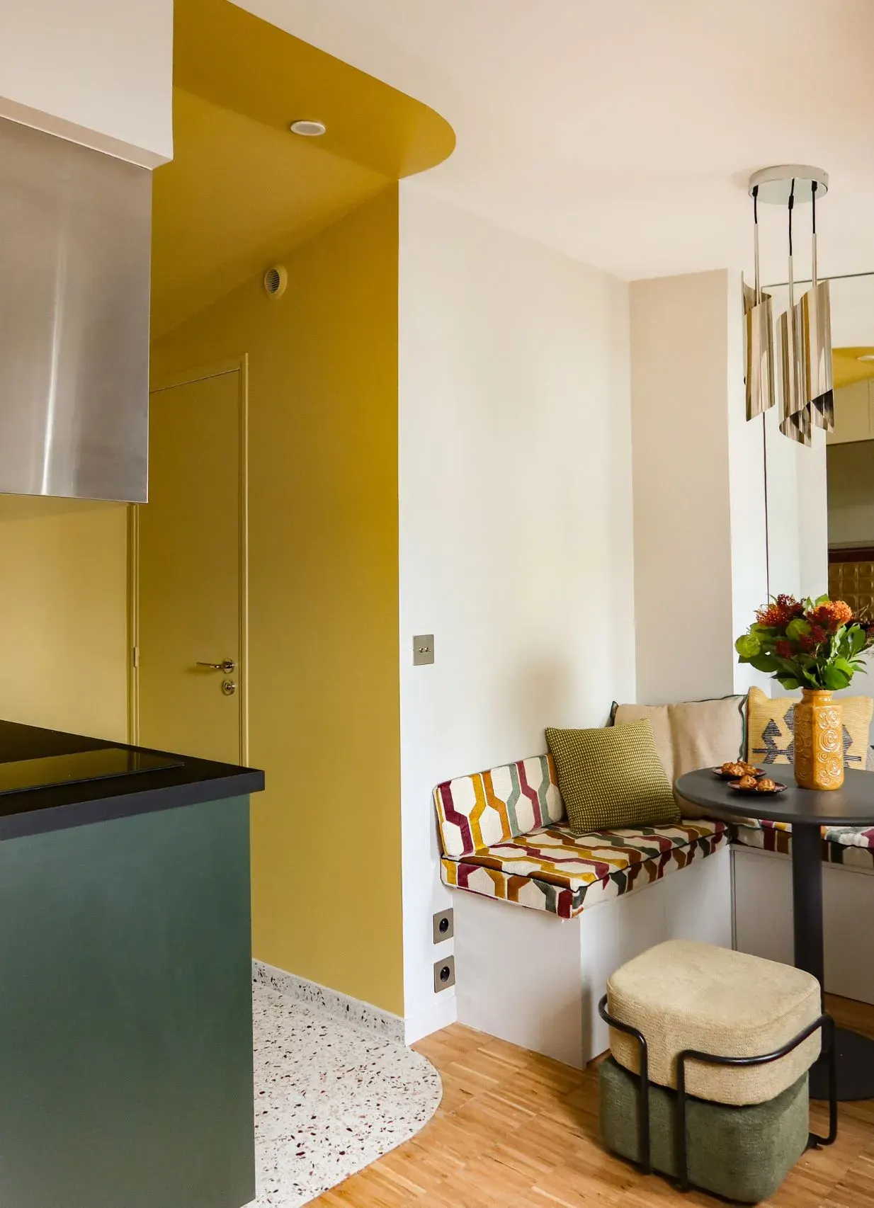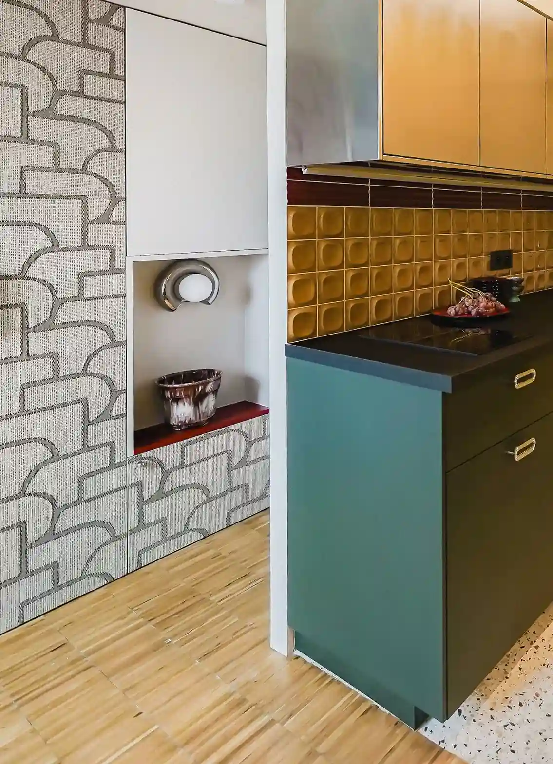 Just beyond the threshold, the gaze is instantly captured by a boldly pop universe. Its visual identity revealed through a generous palette — from khaki green to mustard yellow, with accents of deep claret red. The experience becomes almost sensory: the silky pile of the hide rug answers the concave tiles of the kitchen backsplash, while the bright chrome of the pendant lights mirrors the softness of the velvet banquettes.