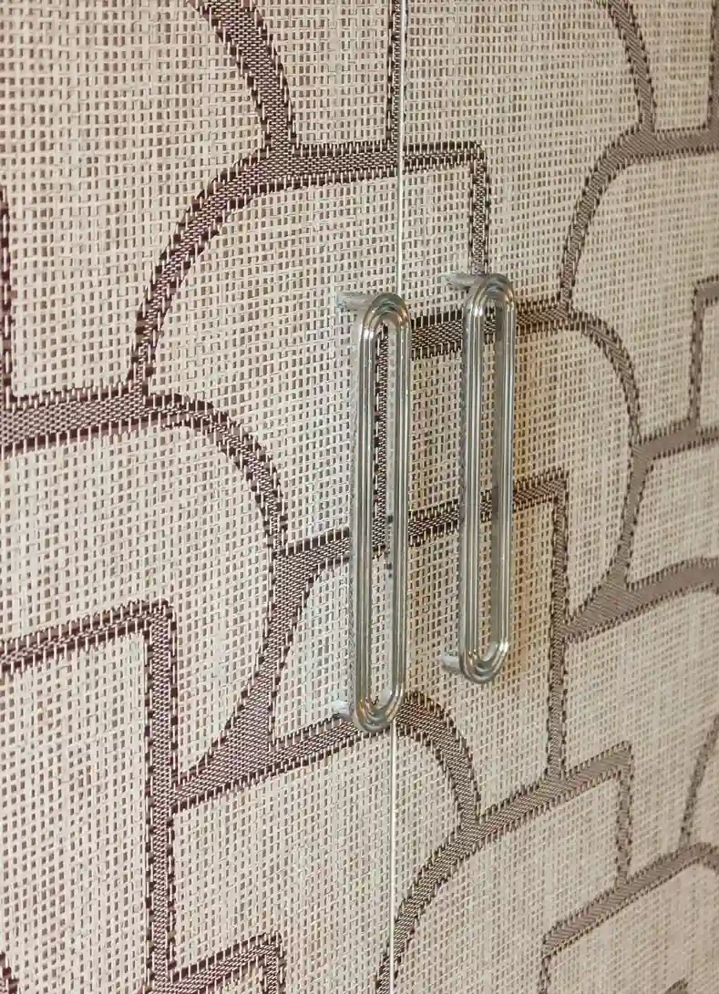 “Optimise and elevate” — that was the mandate behind the bespoke storage wall that stretches from the entrance to the living corner. Wrapped in geometric patterns that resemble textile weaving, this design piece anchors the apartment’s bold character with elegance.