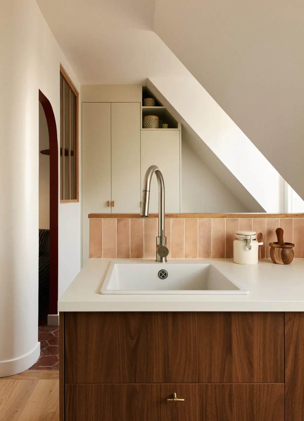 L’appartement mansardé de Mathieu révèle des éléments anciens au pouvoir esthétique remarquable : tomettes au sol, portes en bois patinées par le temps, poutres apparentes. Ce décor dialogue avec un esprit à la croisée du rustique méditerranéen et du wabi-sabi, porté par un mobilier chiné et une palette organique mêlant bruns, terracotta et bleu céladon.